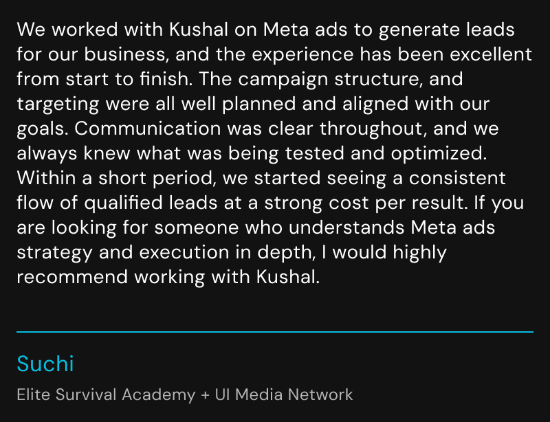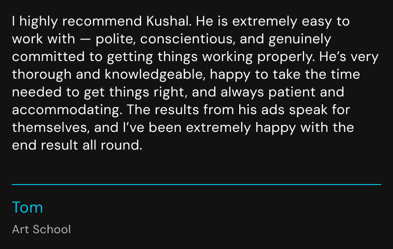 We manage campaigns, ad copy, creative guidance, budgets, A/B testing, and daily optimisations.